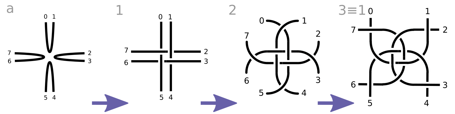 Schritt a in der Abbildung ist nur der Konsistenz der Flechtoperation geschuldet und es empfiehlt sich die Stränge gleich wie in 1 anzuordnen. Anschliessend mit Schritt zwei (siehe unten) fortfahren um 2 zu erhalten.
